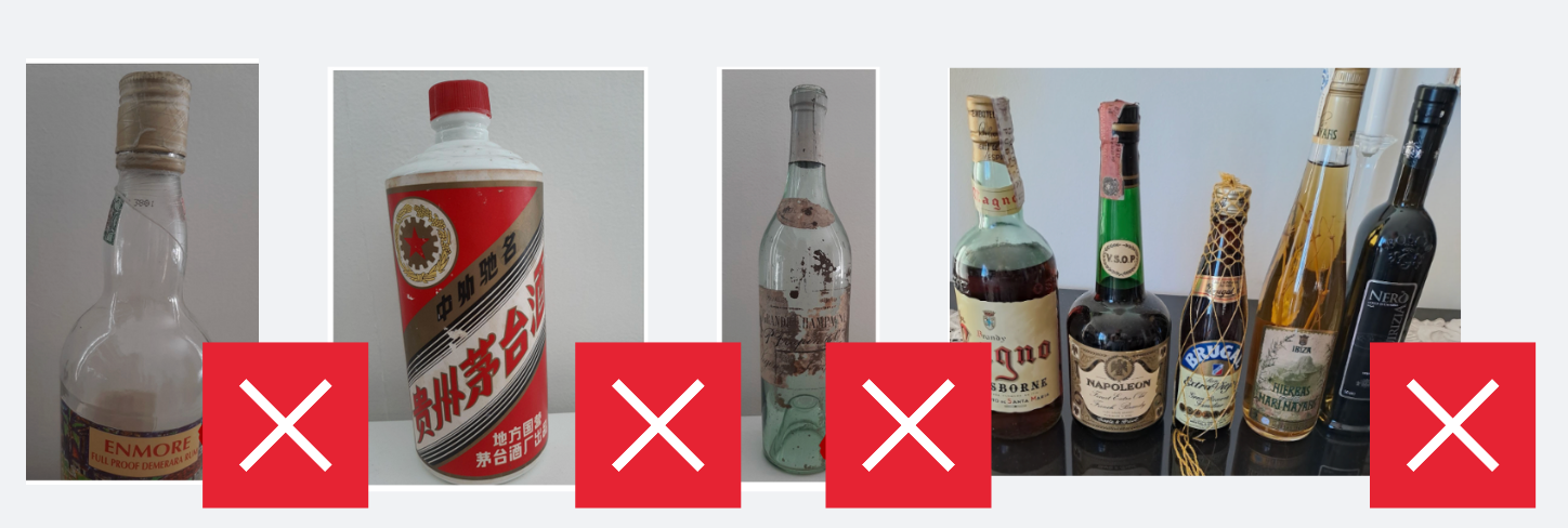 ✔ Fotografier af prægnede koder eller mærker på flaskebunden (Hvis før 1990 eller over €300 i værdi)