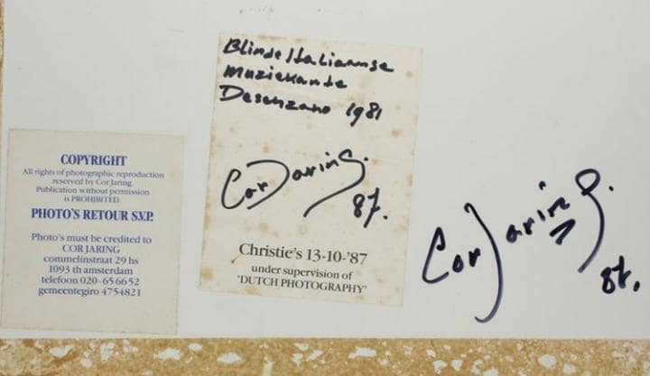 Je me suis retrouvée dans la partie « Arts et estampes » après avoir été attirée par un dessin original du Capitaine Crochet, le personnage de Disney. En fouillant un peu plus, je suis tombée sur le cadeau parfait pour mon ami : un cliché de Cor Jaring, intitulé Musicien italien aveugle, Desenzano, 1981 - précédemment issu d’une vente aux enchères Christie’s dans les années 80. La photo était signée, avec au dos le cachet de la vente aux enchères ; une estimation par un expert d’enchères était donnée (cette estimation est fournie pour les lots qui ont une valeur intrinsèque, donc toujours une bonne indication). Je savais que je tenais le bon bout.